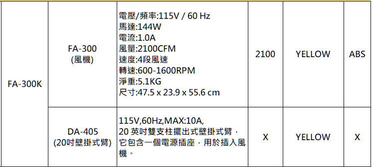 ※ FA-300K 完整套件包括 20 英吋壁掛式安裝臂和強大的軸流風扇