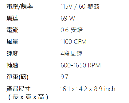 強大且高效 – 1100 CFM 採用先進的高扭矩馬達和獨特的格柵設計,集中氣流高達 120 英尺以上,1100 CFM 同時僅畫出 0.6 安培。